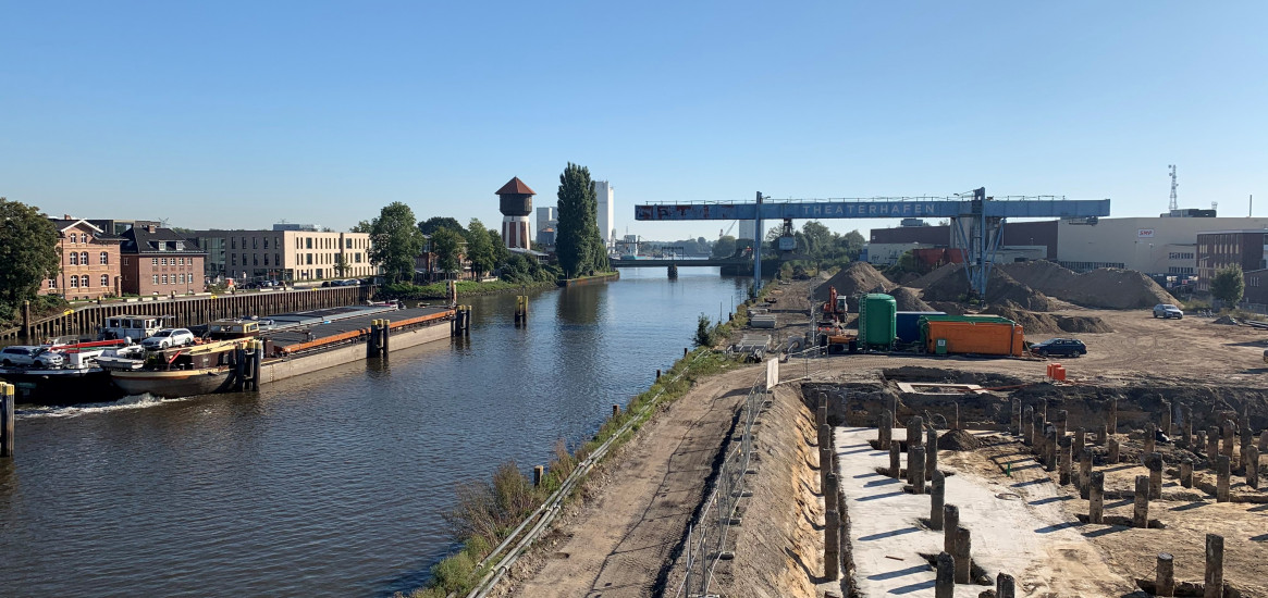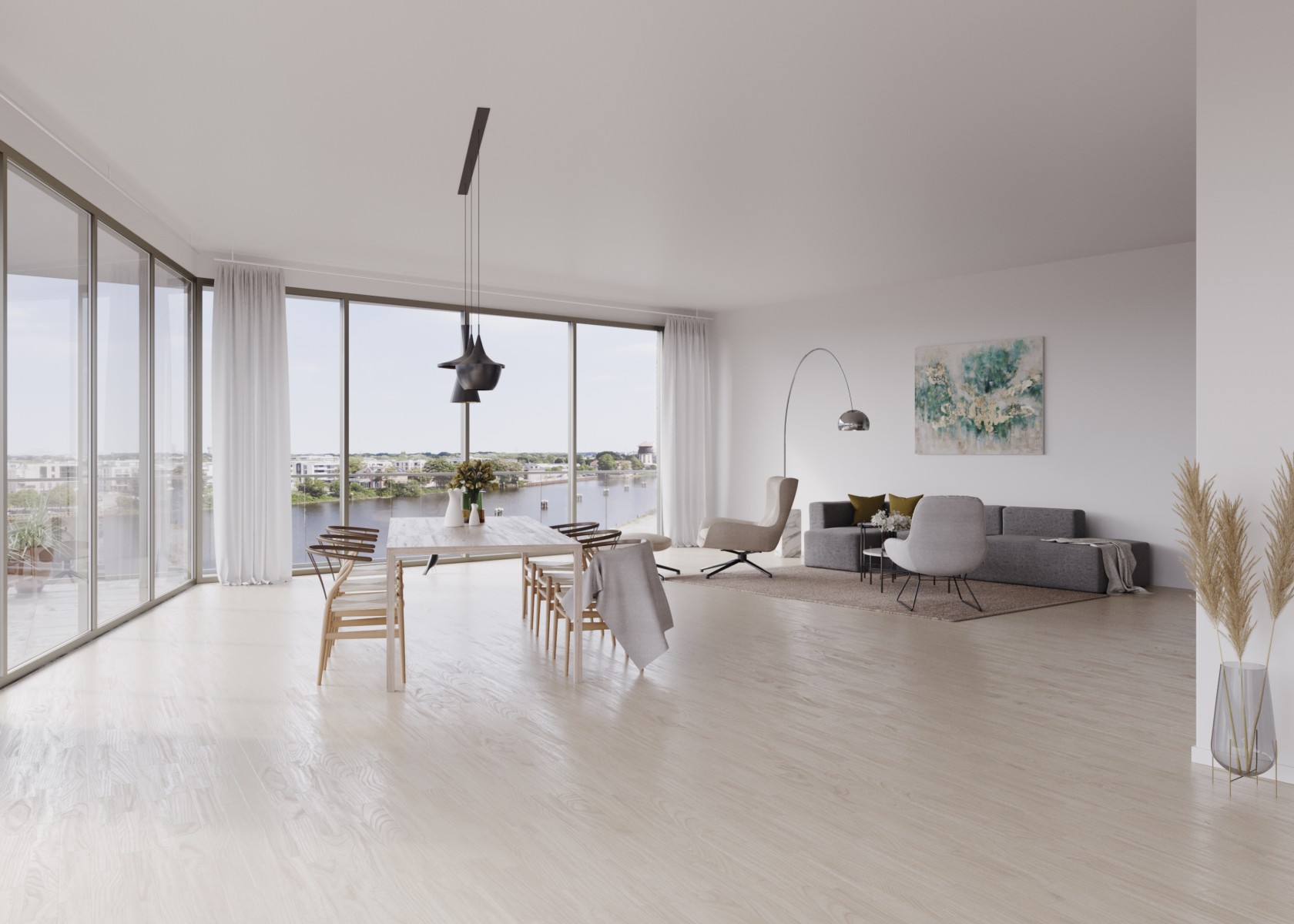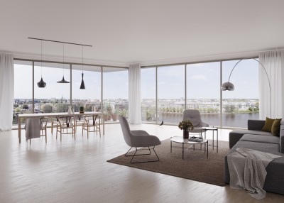 HAVEKANT N°1 ist im wahrsten Sinne des Wortes der Höhepunkt des Quartiers im Alten Stadthafen Süd: Auf elf Ebenen umfasst der Bau rund 90 hochwertige, moderne Wohnungen mit Loggien oder Balkonen – inklusive eines atemberaubenden Blicks über die Hunte und Oldenburg. Im Erdgeschoss entstehen zudem ein großzügiger Kindergarten und attraktive Büroflächen. Auf der anliegenden Piazza laden Aufenthaltsmöglichkeiten direkt am Wasser zum Verweilen ein.